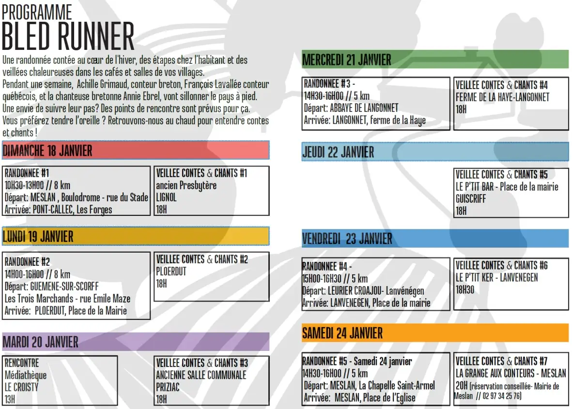 Pour inaugurer cette présence artistique sur le territoire, la Bande à Grimaud, Compagnie du conteur Achille Grimaud, propose un format original : une semaine d’itinérance au cœur du pays. Le public est invité à suivre un trio d’artistes composé d’un conteur breton (Achille Grimaud), d’un conteur québécois (François Lavallée) et d’une chanteuse bretonne (Annie Ebrel).
